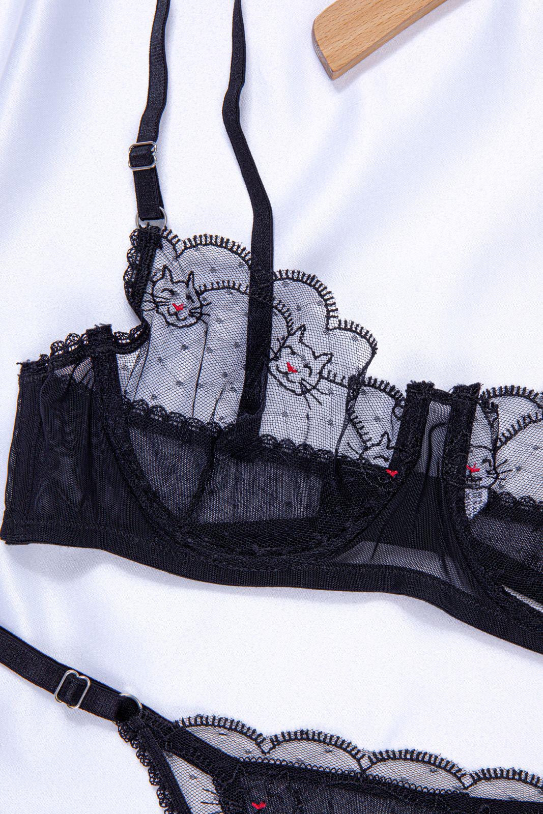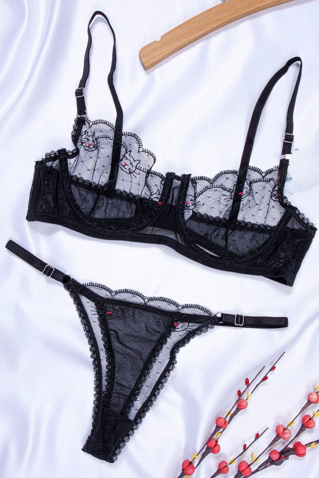 Şeffaf tül üzerine işlenmiş kedi figürlü nakış detayıyla eğlenceli ve çekici bir görünüm sunuyor. Günlük kullanımda konfor, özel anlarda ise farklı tarz ön plana çıkar.